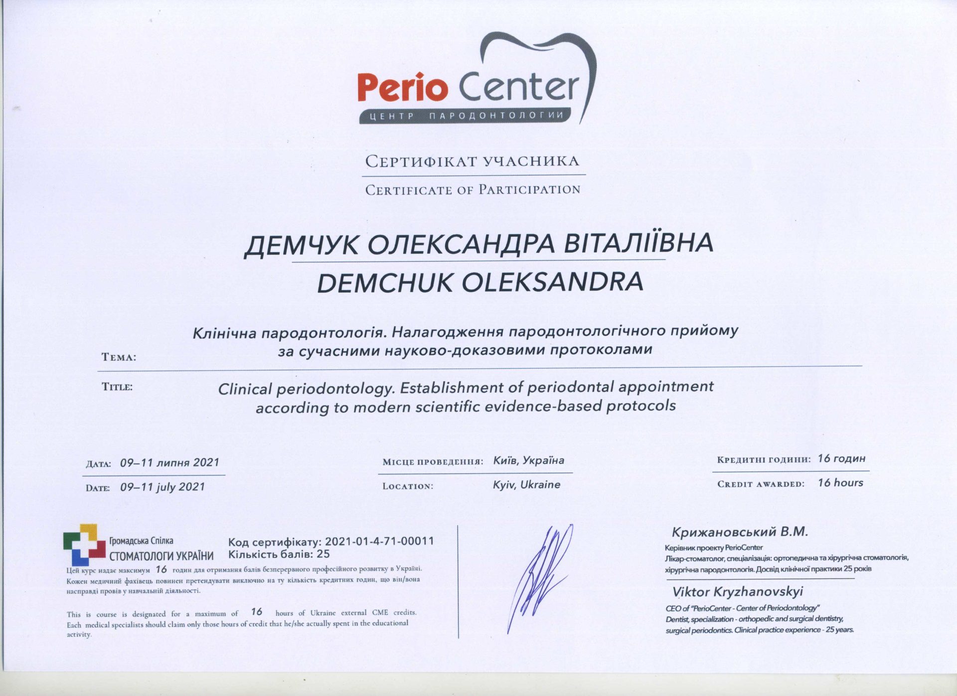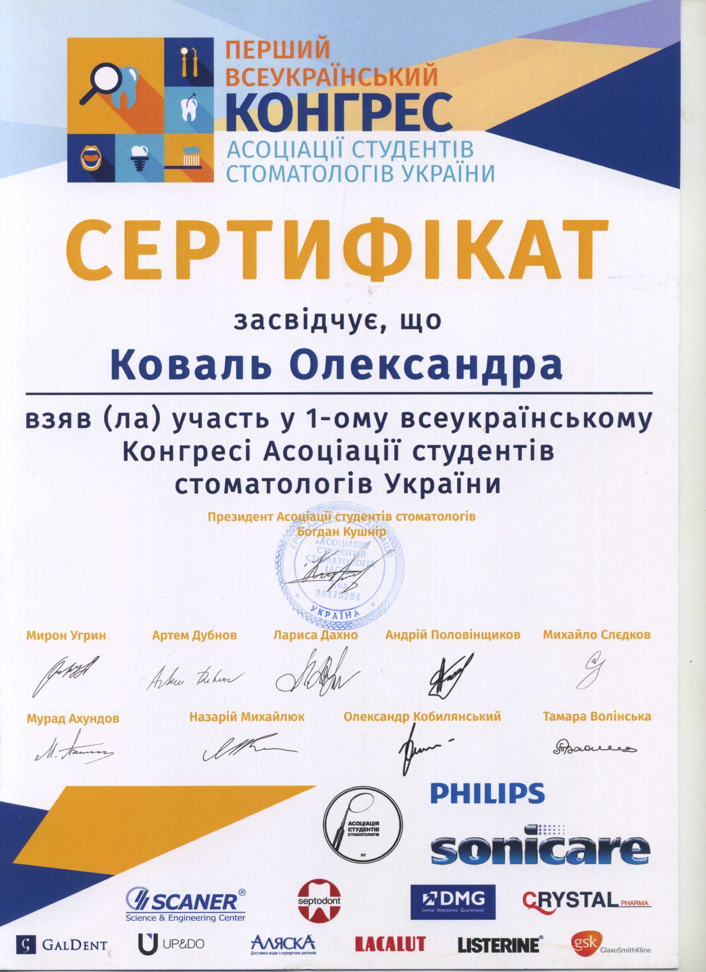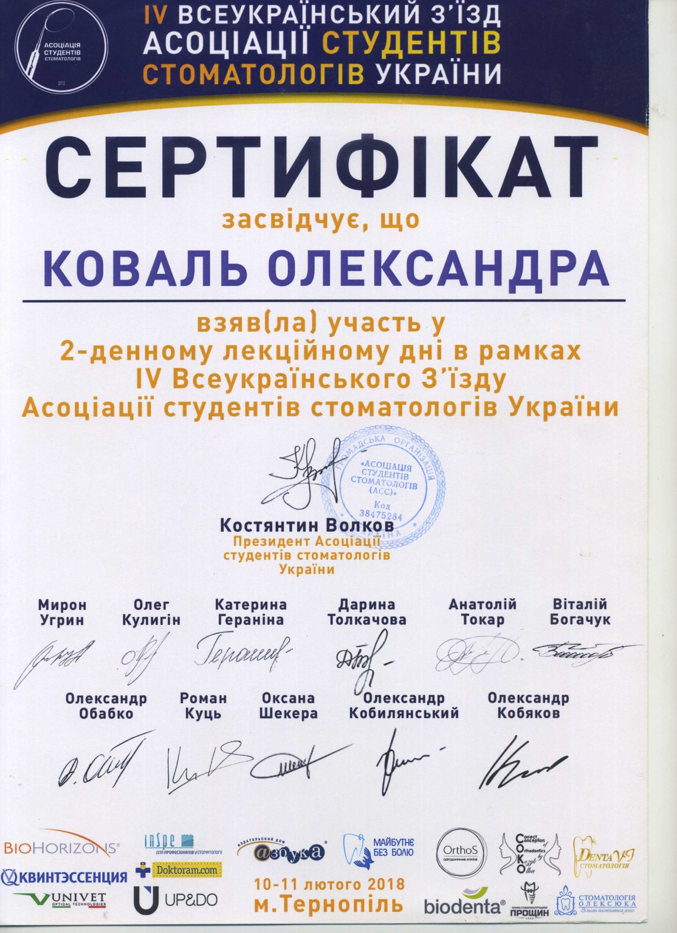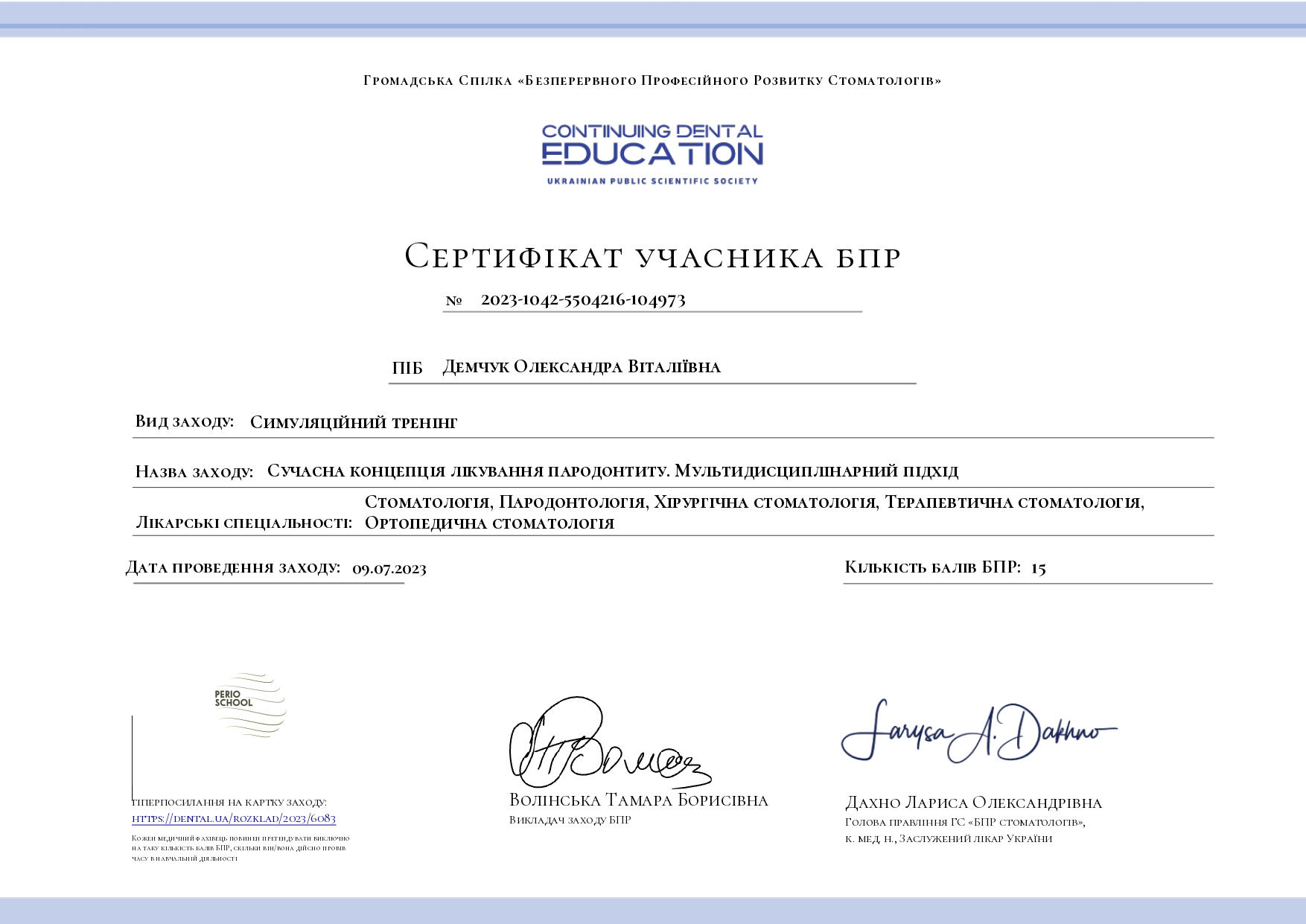 • 2021 – закінчила інтернатуру на базі НМУ ім. О.О. Богомольця за спеціальністю стоматологія.